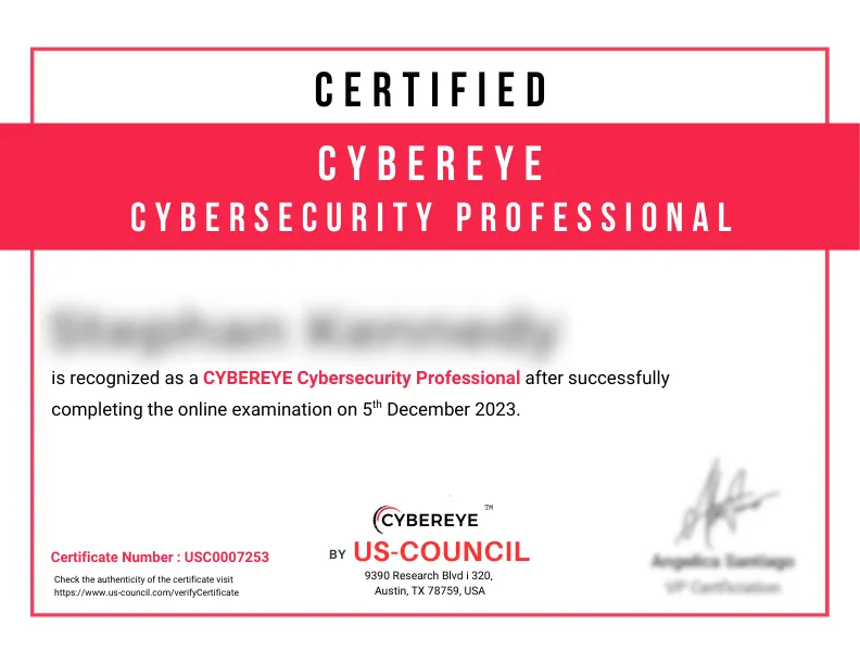 The CYBEREYE Cybersecurity Professional Certification program by US-Council is a premier program aimed at equipping individuals with the essential knowledge and skills to protect corporate, government, and defense networks from cyber threats and vulnerabilities.