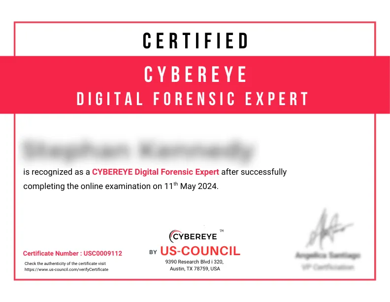 The CYBEREYE Digital Forensic Certification program by US-Council equips you with the skills to conduct thorough investigations into cybersecurity incidents, analyze digital evidence, and secure systems against malicious hacking, trojans, backdoors, and worm attacks.
